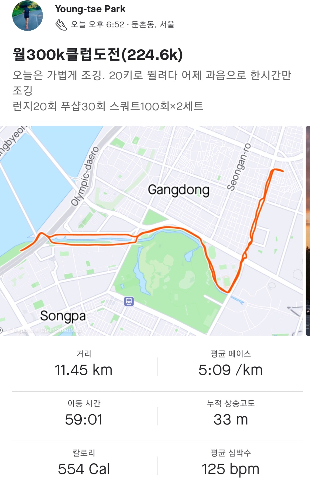 어제 과도한 음주로 오늘은 1시간 조깅.
