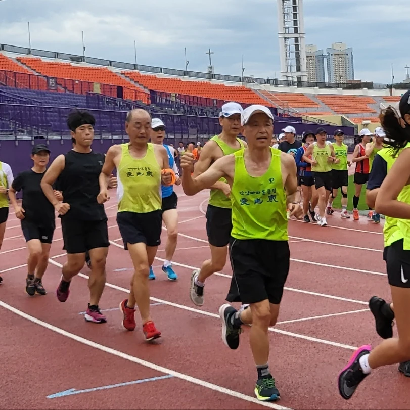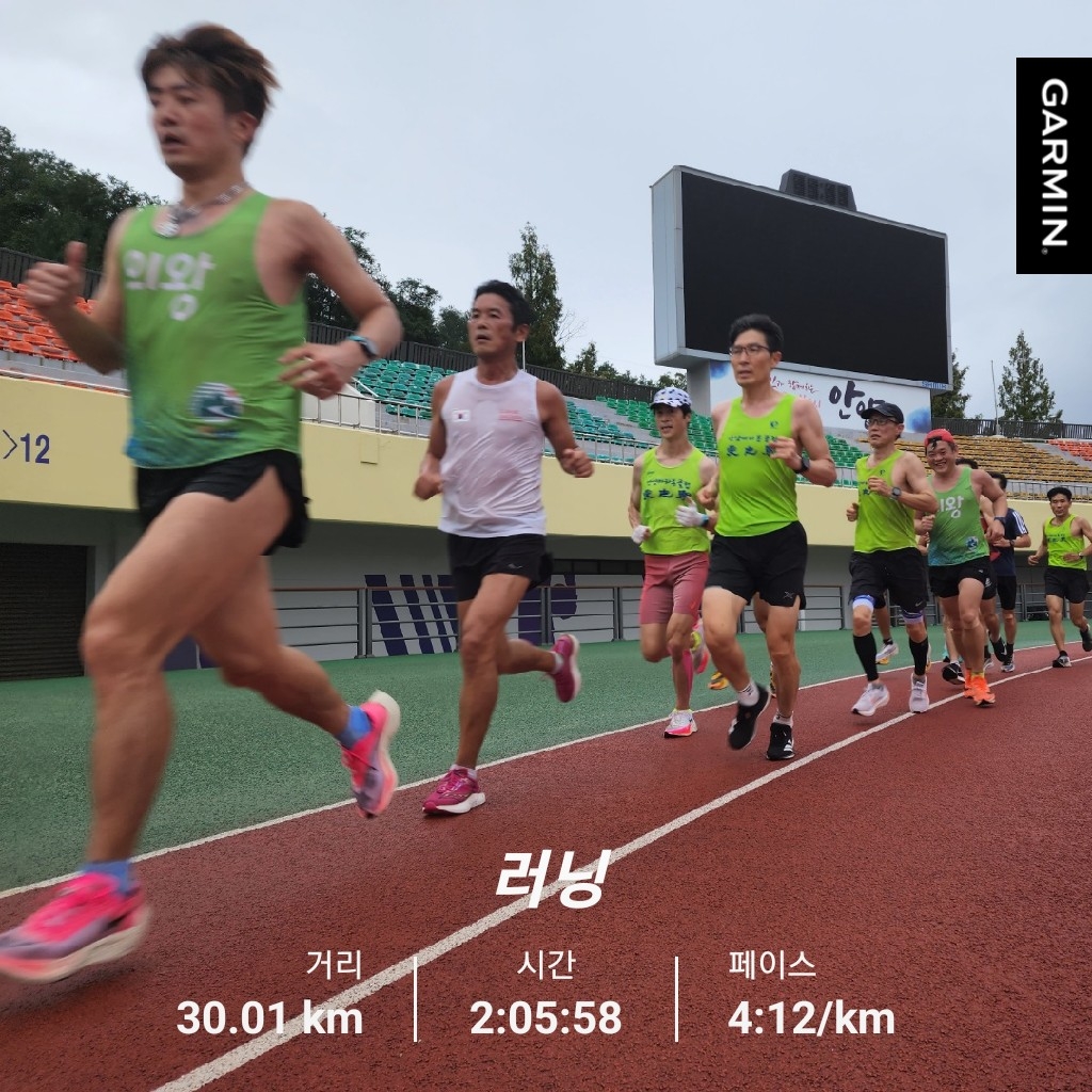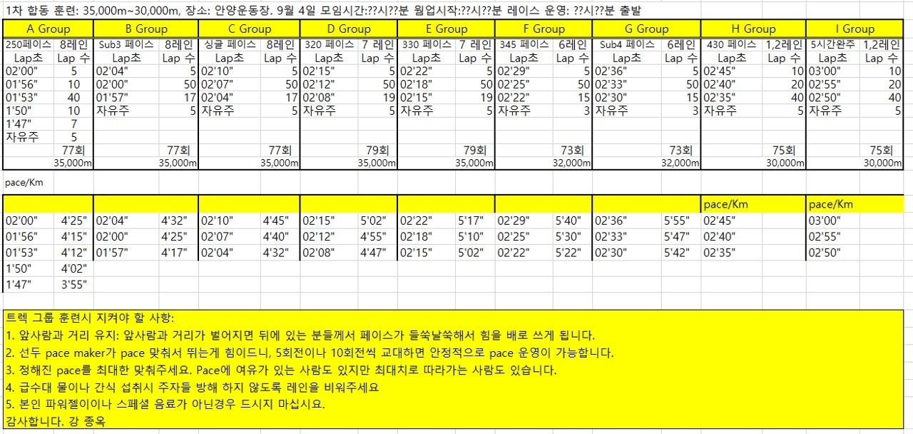 나는 호기롭게 제일 마지막 250페이스의 8레인에서 안대환 등 안양권 강자들과 35키로 완주를 목표로 함께 출발.
