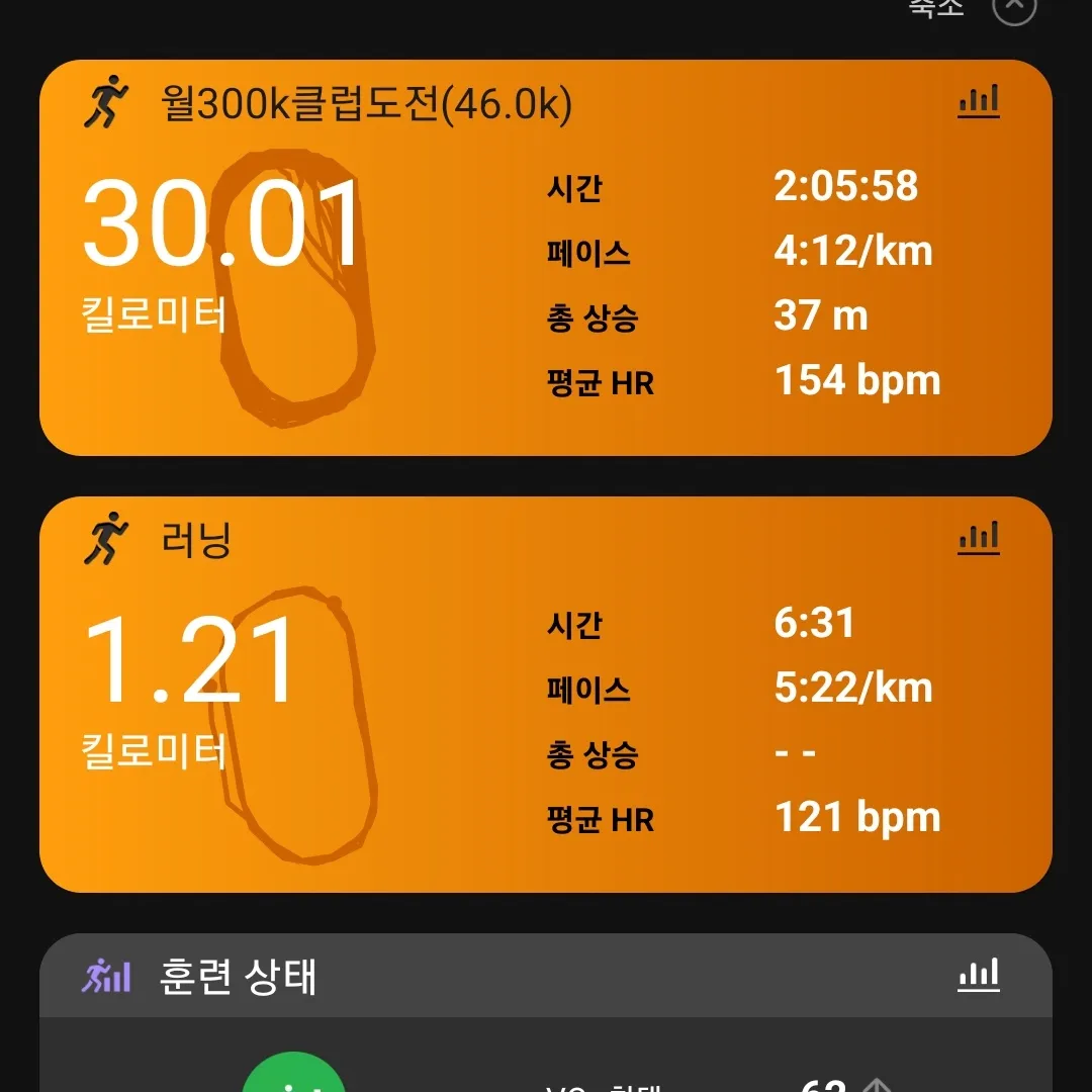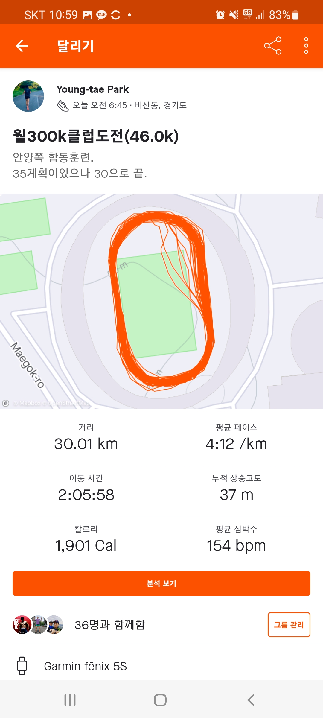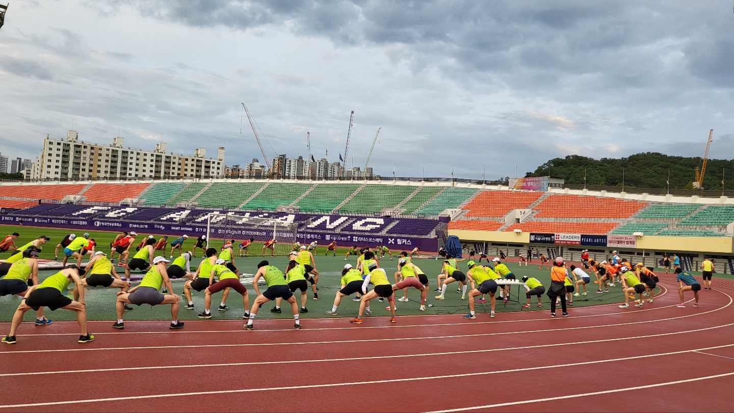 30키로 후 한바퀴 조깅과 스트레칭으로 돌고 스쿼트 등 보강까지 하고 천천히 레이스 하는 분들 응원.
