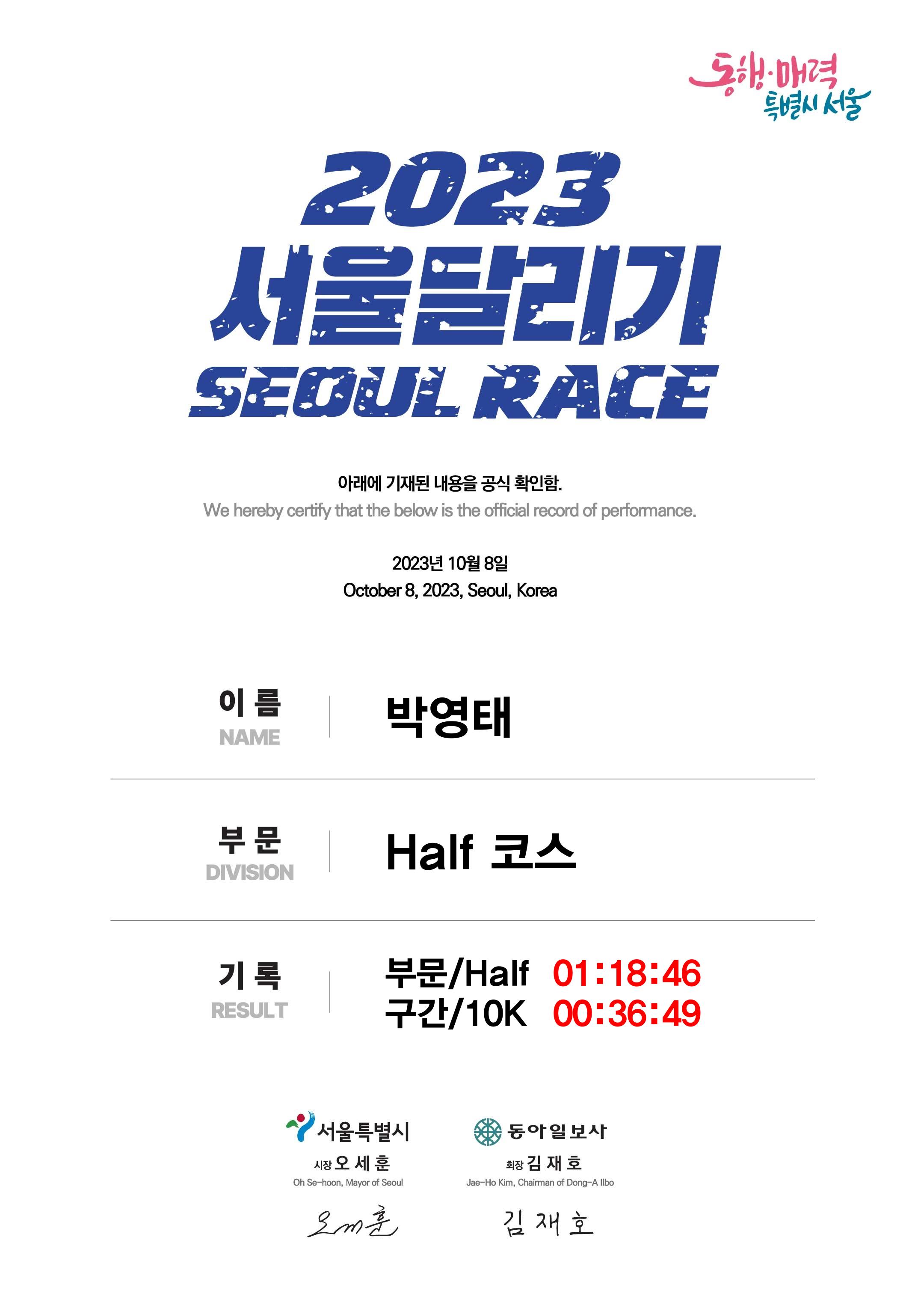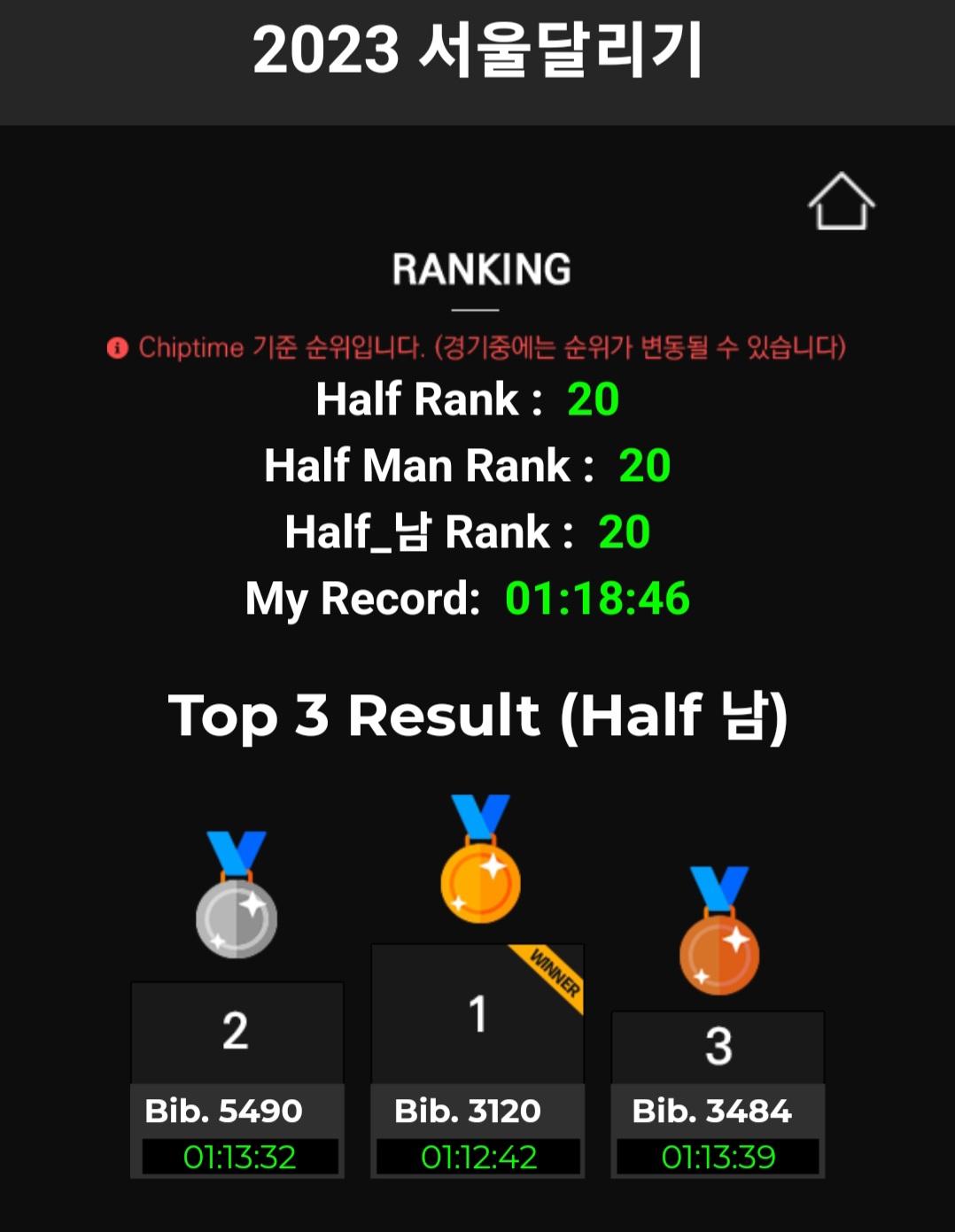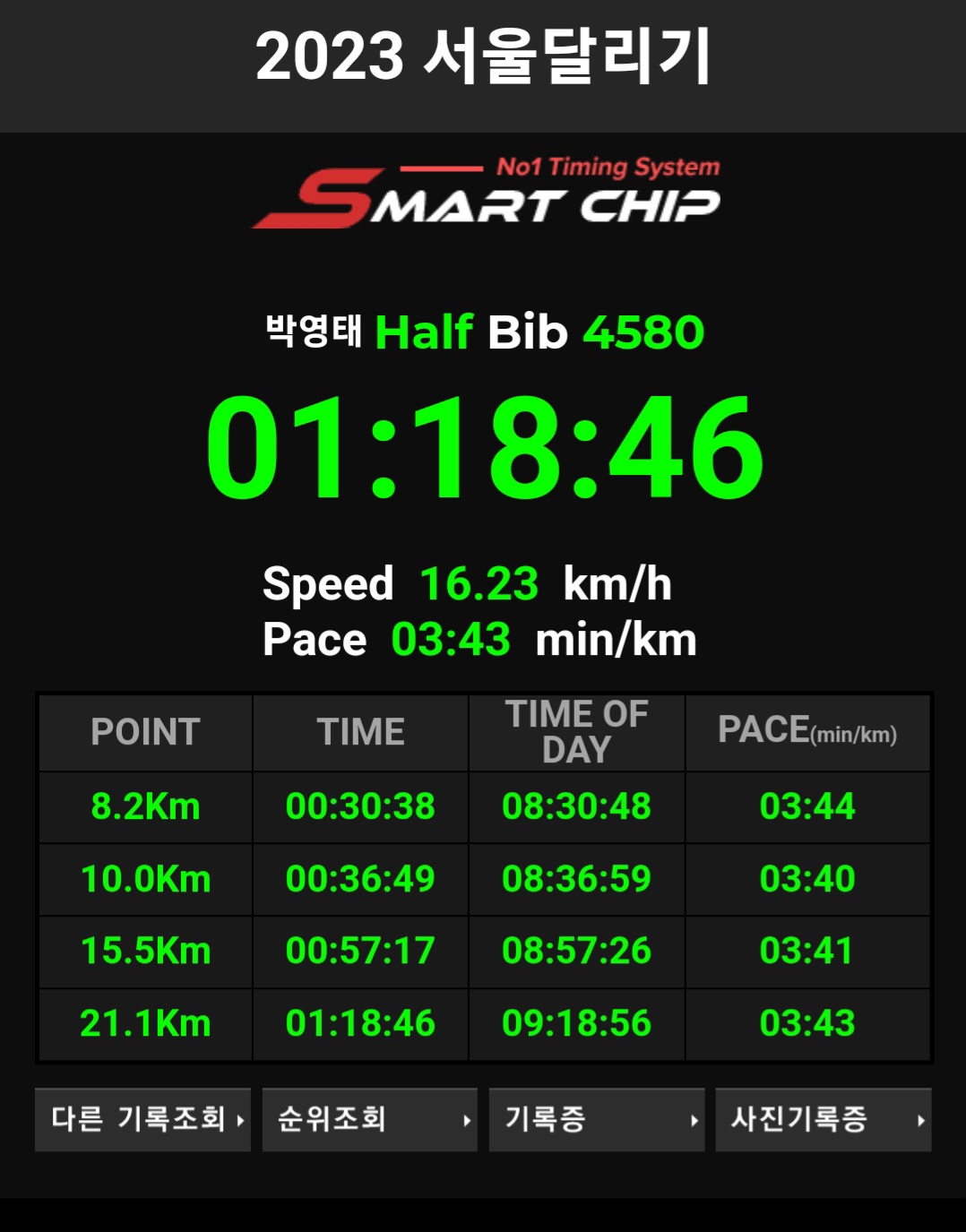 결과는 개인 PB인 1시간18분46초. 평페로 따지면 344정도.