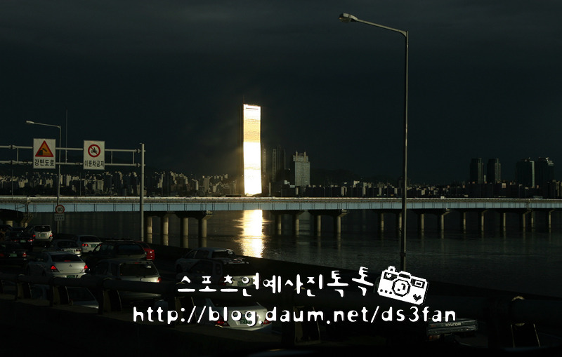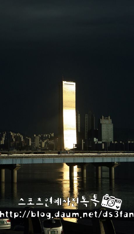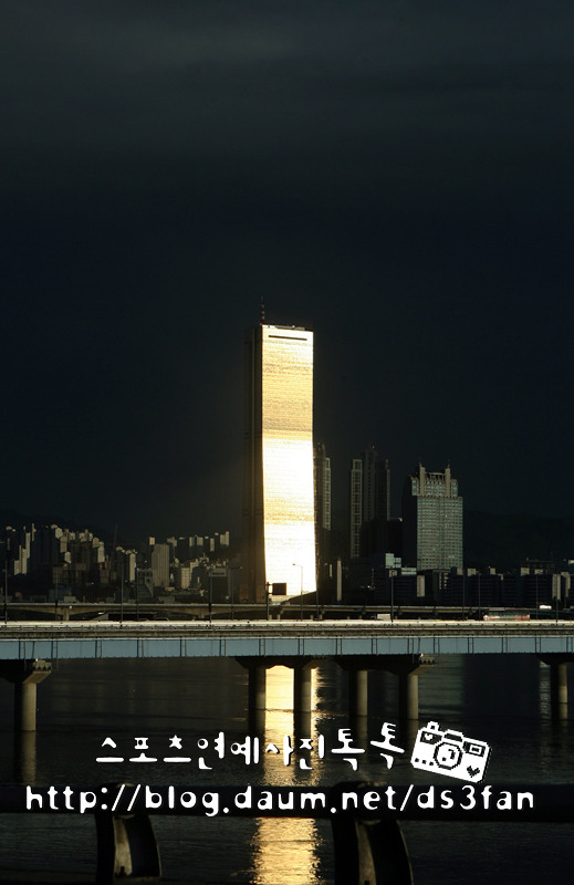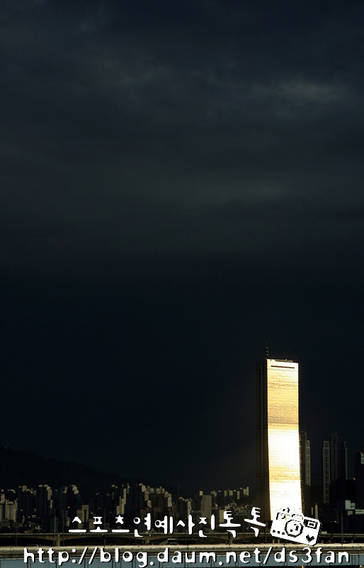 먹구름 속에서 황금빛으로 빛나는 63빌딩